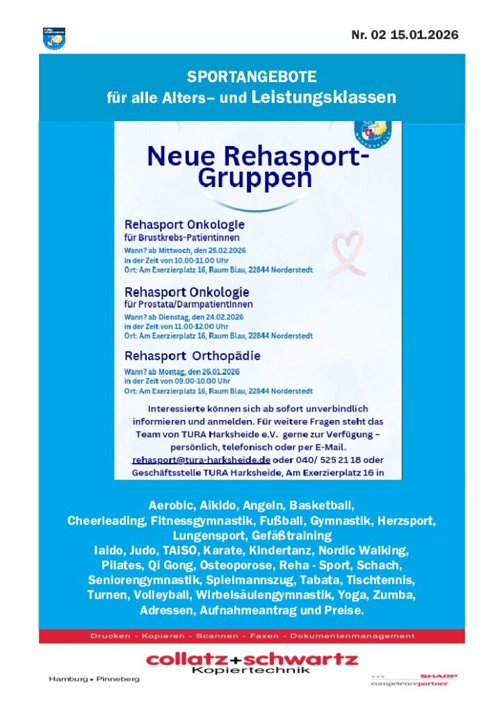 Wir bieten ein umfangreiches Turn-, Fitness- und Gesundheitsangebot in über 100 Gruppen von 51 qualifizierten Übungsleitern/-leiterinnen und Sportlehrern/-lehrerinnen an. Das abwechslungsreiche Kursprogramm und ein vereinseigenes Fitness-Studio komplettieren die Vielfalt. Neben den Ballsportarten, wie z.B. Fußball, Handball oder Basketball wird bei TURA Harksheide z.B. auch Schach gespielt, getanzt, Skat gespielt, geangelt oder Musik gemacht und vieles mehr.