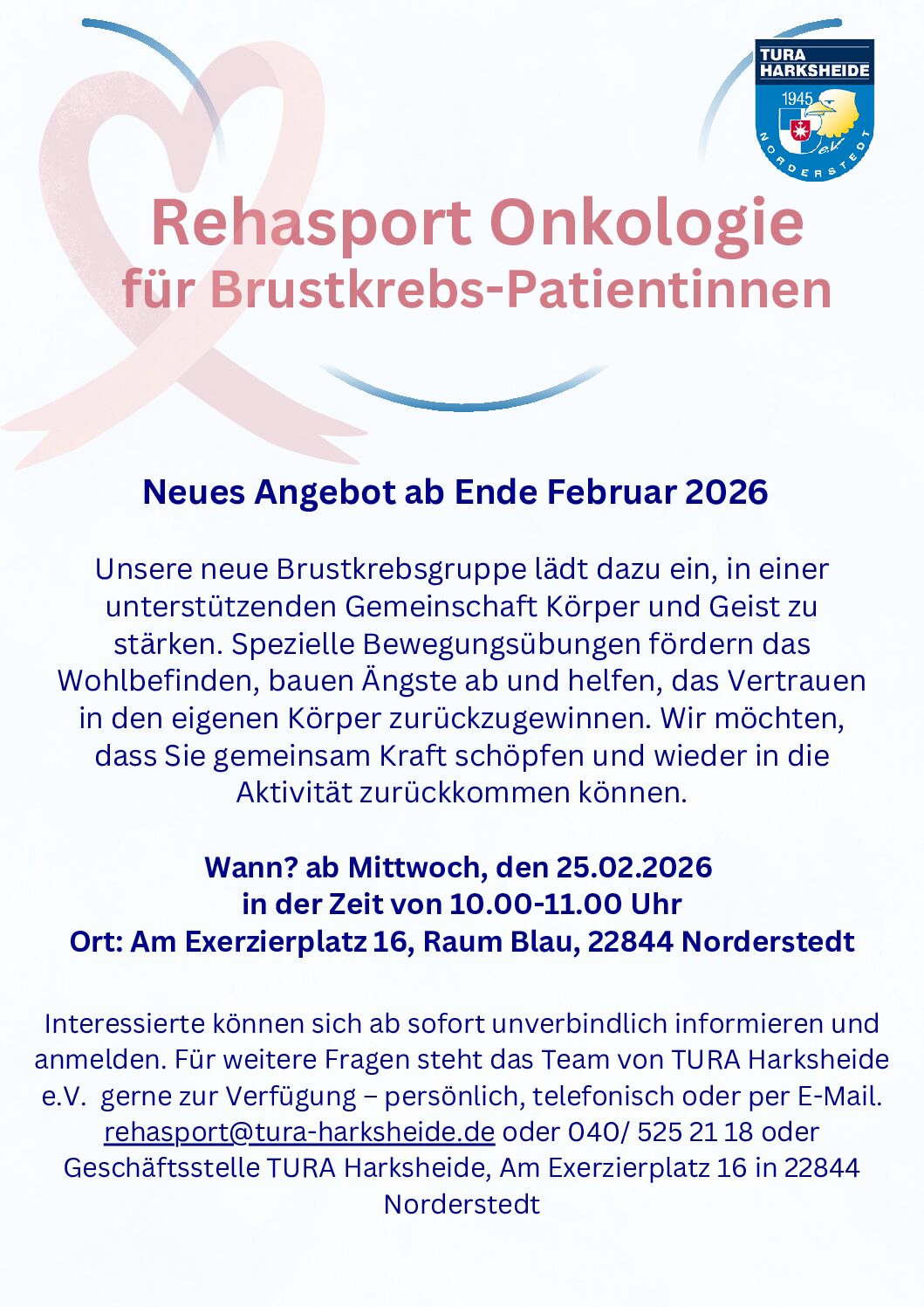 NEU: Rehasport Onkologie für Brustkrebspatientinnen ab Februar 2026 15 Jan. 2026Sabine SauerAllgemein, Gesundheitssport