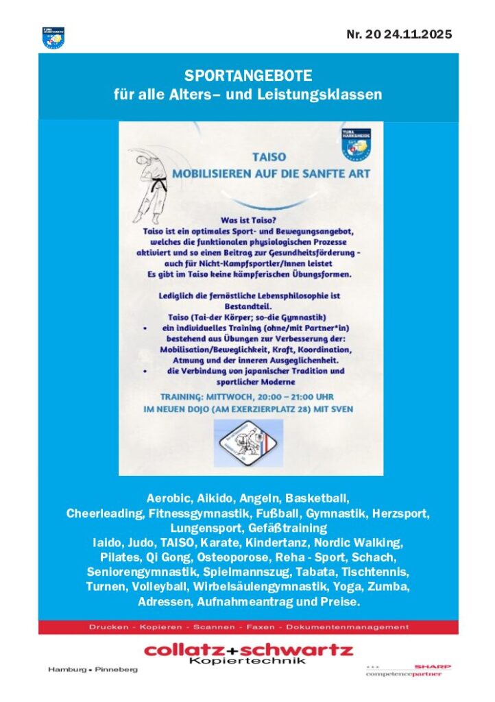 Wir bieten ein umfangreiches Turn-, Fitness- und Gesundheitsangebot in über 100 Gruppen von 51 qualifizierten Übungsleitern/-leiterinnen und Sportlehrern/-lehrerinnen an. Das abwechslungsreiche Kursprogramm und ein vereinseigenes Fitness-Studio komplettieren die Vielfalt. Neben den Ballsportarten, wie z.B. Fußball, Handball oder Basketball wird bei TURA Harksheide z.B. auch Schach gespielt, getanzt, Skat gespielt, geangelt oder Musik gemacht und vieles mehr.