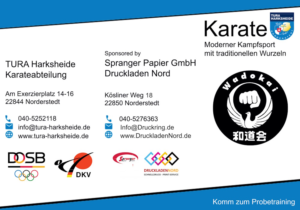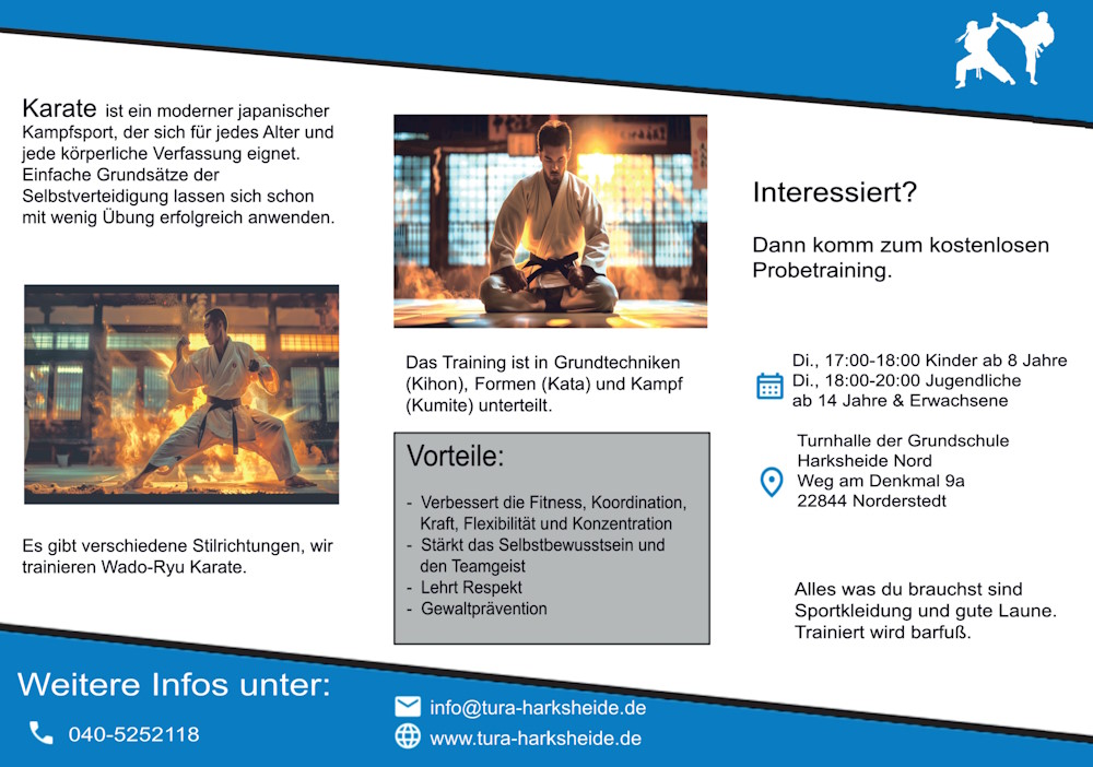 Karate gilt daher als anerkannter Gesundheitssport der Weltgesundheitsorganisation WHO. Der neue Flyer der TURA-Karateabteilung lädt Interessierte zum Probetraining ein: